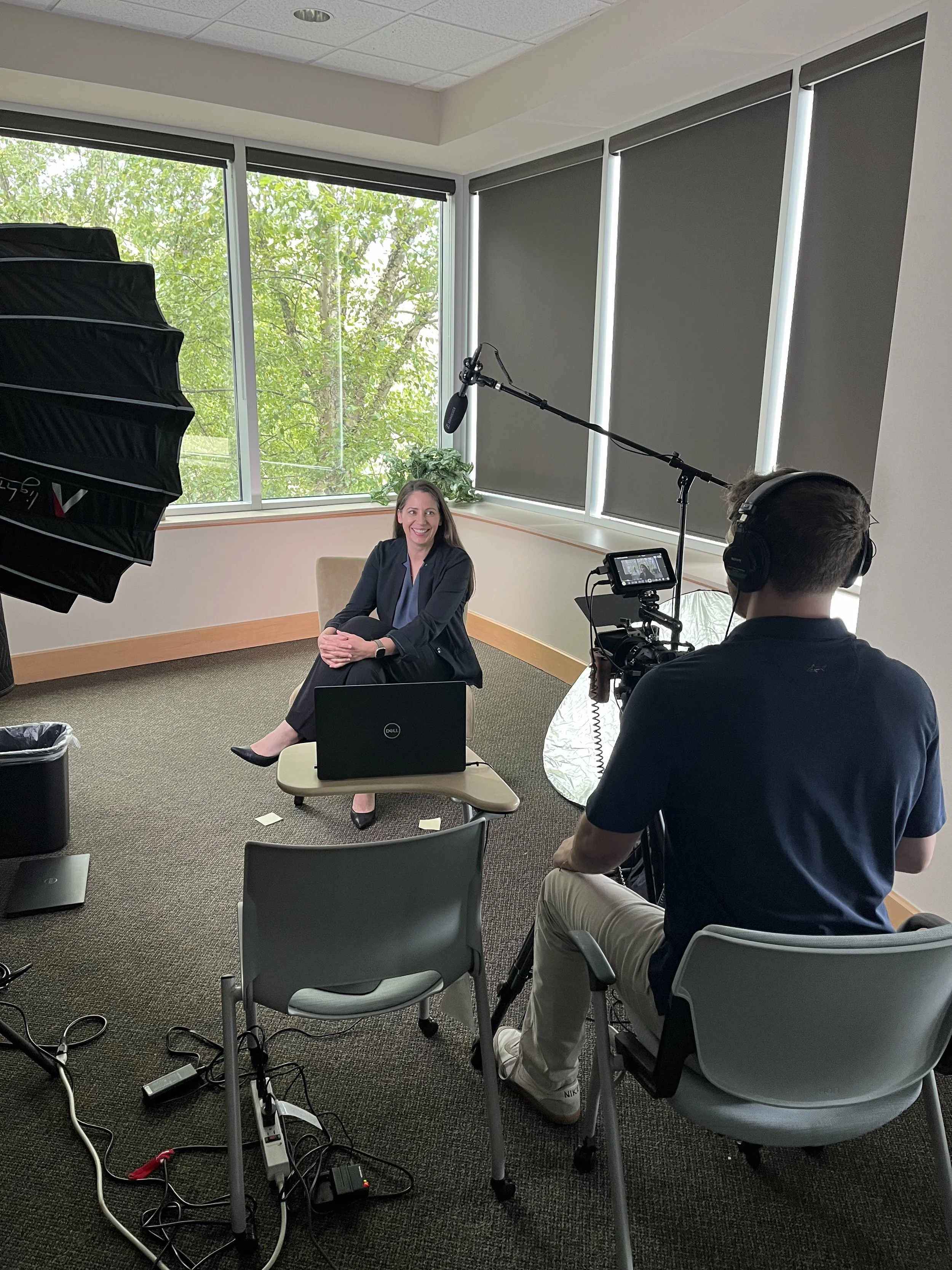 A woman in a black blazer sitting on a beige chair in a recording studio. She is smiling and facing the camera, which is operated by a man wearing headphones. The studio has large windows with shades and equipment, including a microphone, lighting, a monitor, and cables.